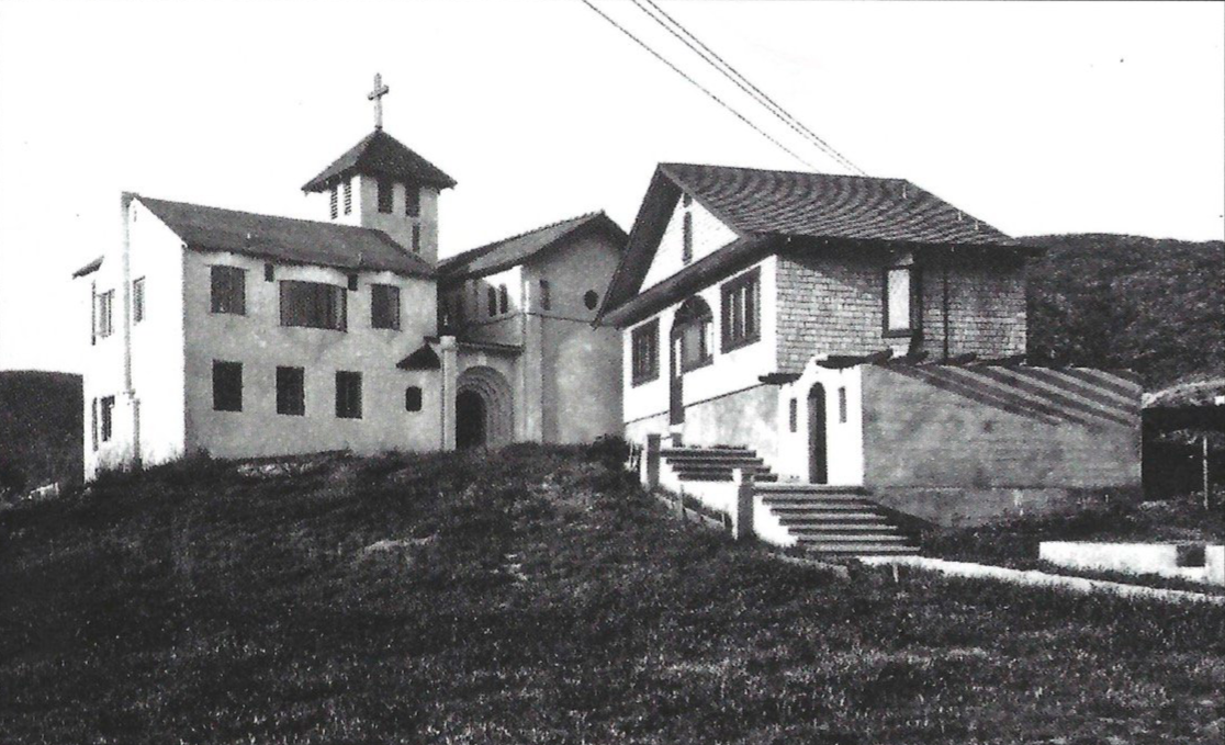 We had seen several mentions, as early as 1925, of an earlier building that had been the first home of the St. Mary’s congregation, as well as a few grainy photos of an imposing structure and tower. Details were hard to come by. One point was particularly intriguing; all the early references identified the building as “St. Francis By-the-Sea,” not “St. Mary’s.” The different names were a source of confusion. We spoke with Pat August, a long-time member of St. Mary’s vestry. She was able to provide answers and recommended the book “The Chapel on the Hill” by Starr Helms. Helms had already done the hard work.
